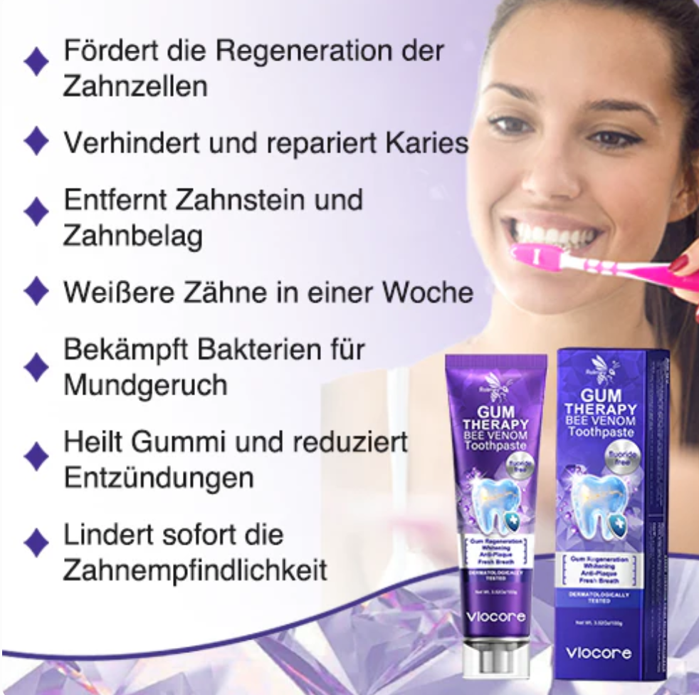 Geef je glimlach de zorg die het verdient met Platefule™ VioCore Bee Venom Dental Repair Toothpaste. Deze door tandartsen goedgekeurde formule wordt wereldwijd door meer dan 120000 klanten vertrouwd en is ontworpen om je tanden en tandvlees diep te reinigen te herstellen en te beschermen met de krachtigste natuurlijke ingrediënten.